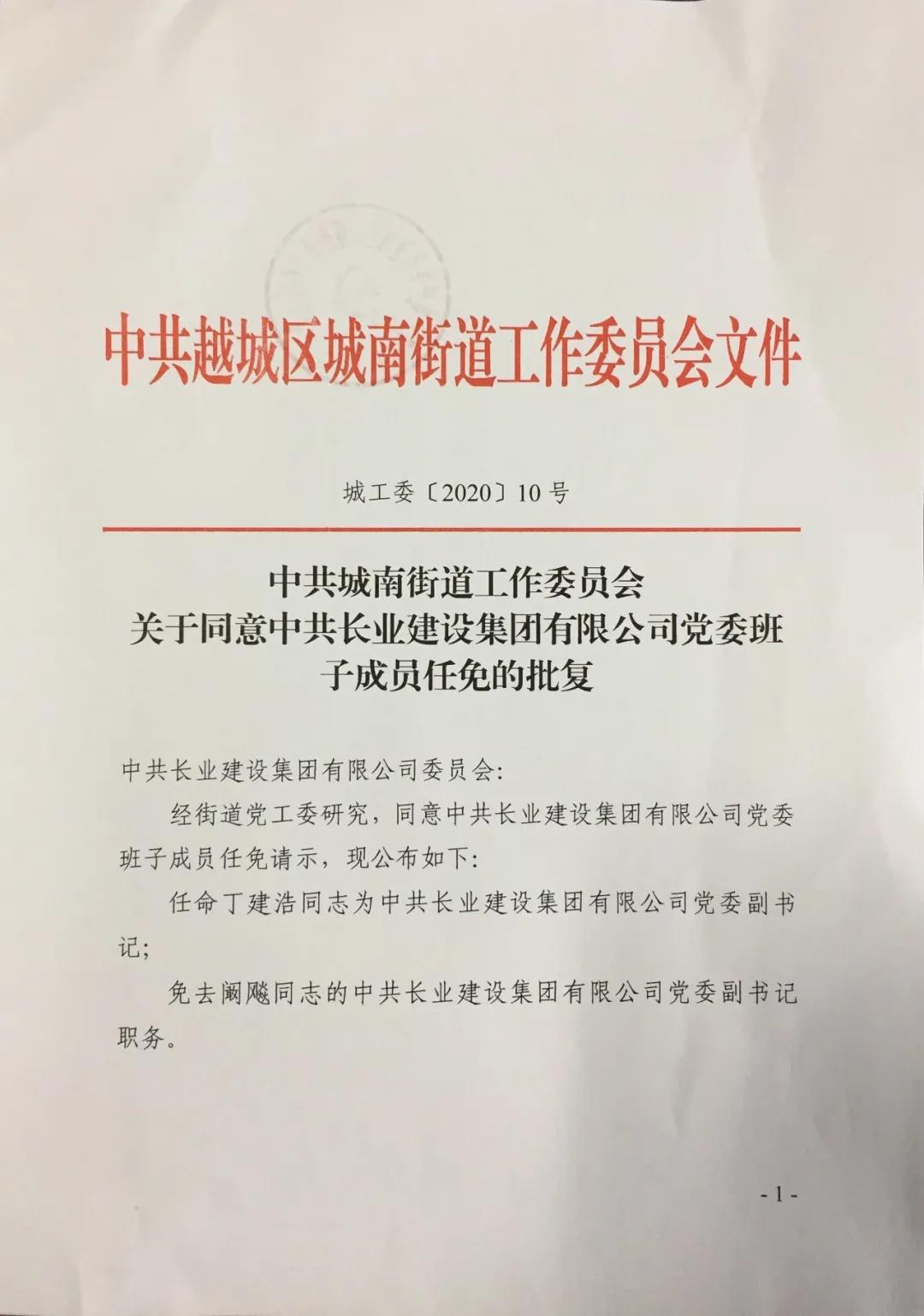 2020年2月25日,中共越城區(qū)城南街道工作委員會發(fā)文批復(fù),同意中共長業(yè)建設(shè)集團有限公司黨委班子成員任免。