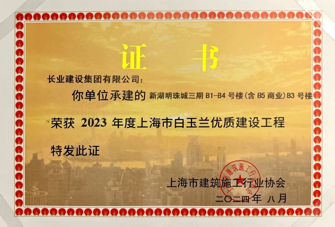 2023年度上海市建設工程最高獎“白玉蘭”獎頒獎典禮日前召開。由長業(yè)建設集團有限公司承建的新湖明珠城三期B3號樓、B4號樓以及南大地區(qū)28-02地塊T1塔樓工程喜摘“白玉蘭”獎。